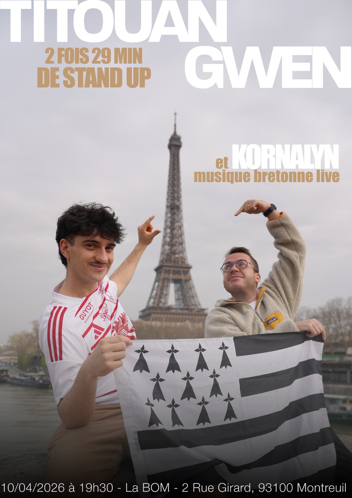Deux humoristes bretons, deux styles, deux passages de 29 minutes. Titouan et Gwen montent sur scène pour deux sets de stand-up bien à eux, entre regards du quotidien, humour et énergie bretonne.